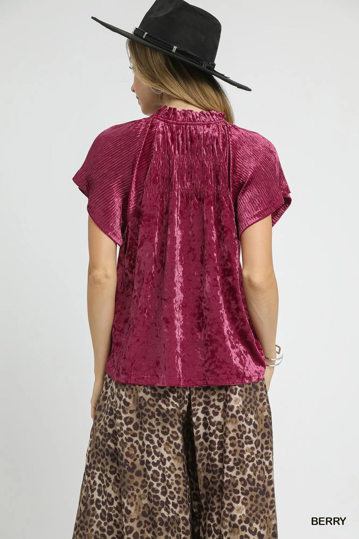 The Crushed Velvet Pleated Blouse is a luxurious and stylish choice for your wardrobe. Made from soft crushed velvet fabric, this blouse offers a glamorous and elegant look. The pleated detailing adds texture and dimension to the design, creating a chic and sophisticated appearance. Perfect for dressing up for special occasions or adding a touch of luxe to your everyday outfit, this blouse is a versatile and fashionable piece that will make you feel fabulous.