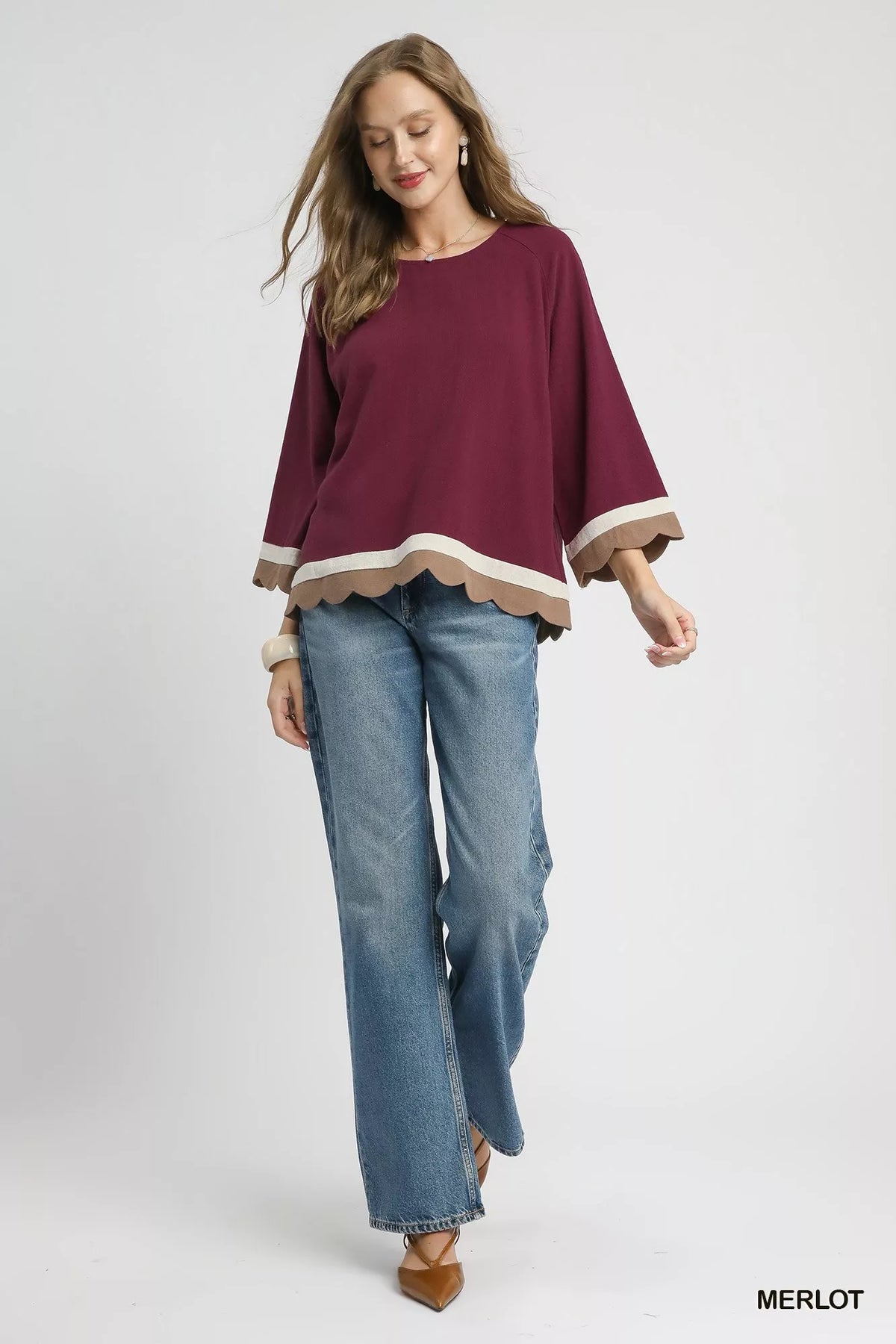 Make a stylish statement with this Scalloped Hem Color Block Top. The color block design adds a modern and eye-catching element to the top, creating a bold and trendy look. The scalloped hem detail provides a unique and elegant touch, adding a feminine flair to the overall design. With its combination of colors and textures, this top is perfect for adding dimension and visual interest to your outfit. Pair it with jeans or trousers for a chic and contemporary ensemble that is sure to turn heads. This Scalloped Hem Color Block Top is a versatile and fashionable piece that can easily take you from day to night with effortless style.