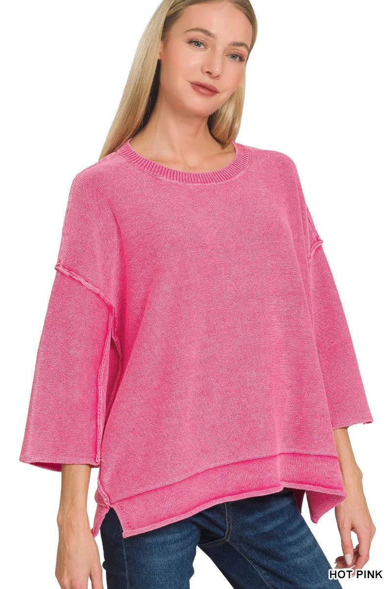 Zenana Washed 3/4 Sleeve Boxy Sweater In Hot Pink