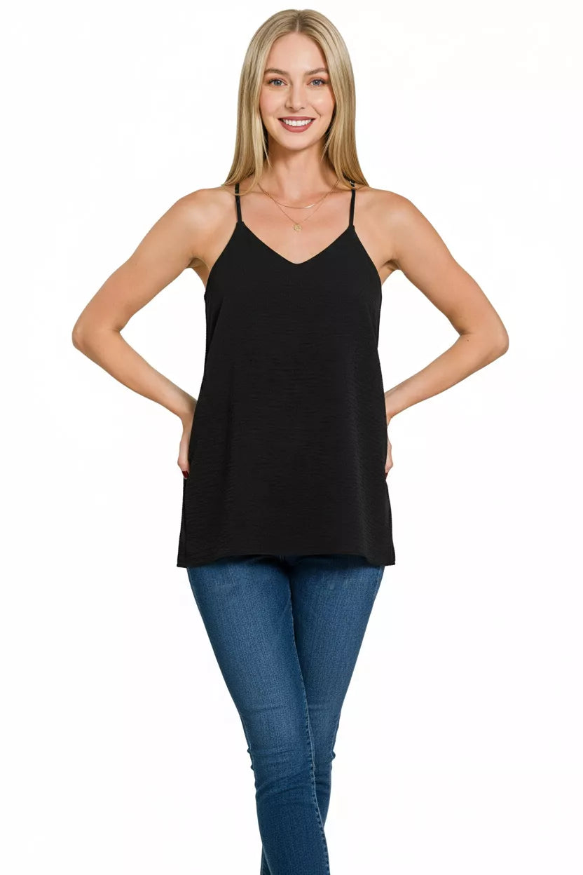 Zenana Woven Airflow Adjustable Strap V-Neck Cami In Black