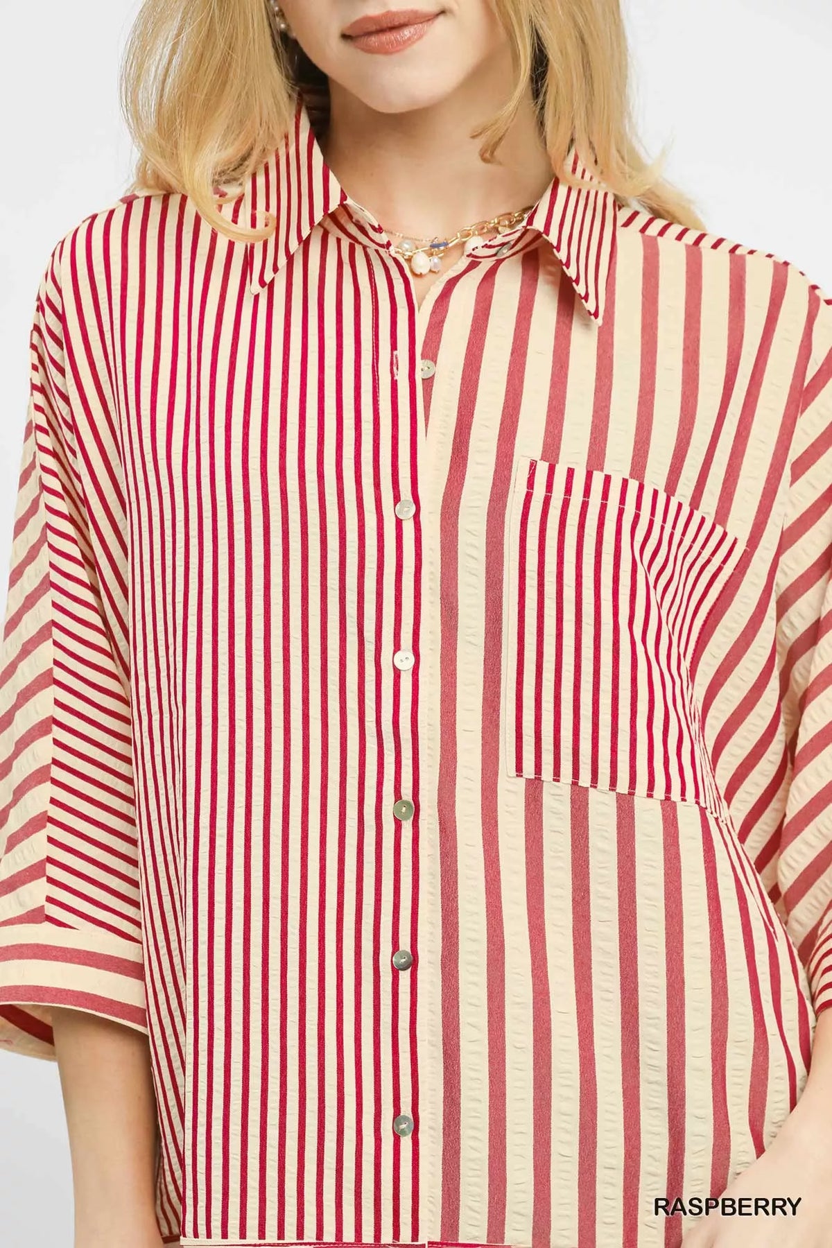 Umgee Mixed Stripe Oversized Button Down Top In Raspberry