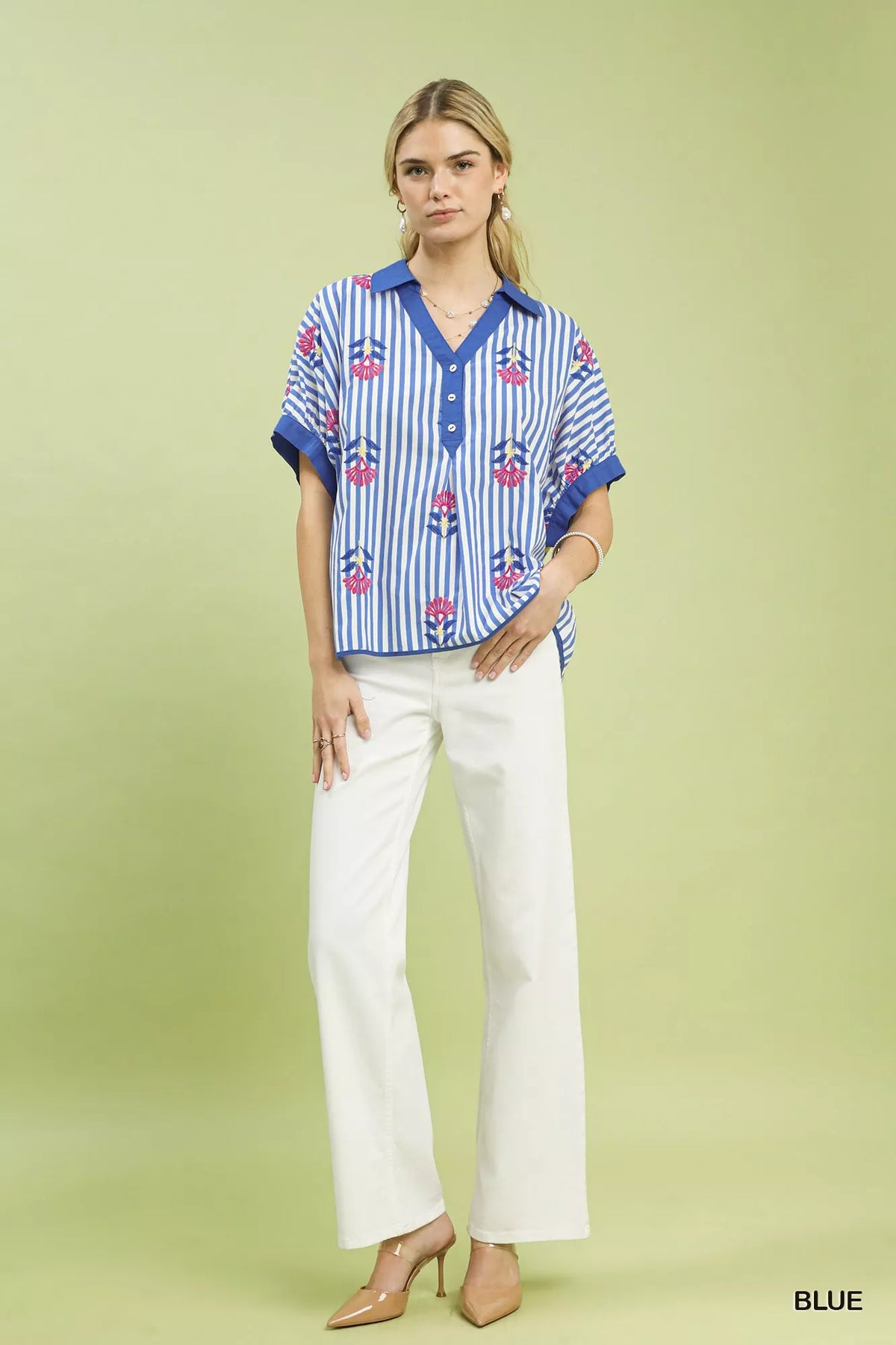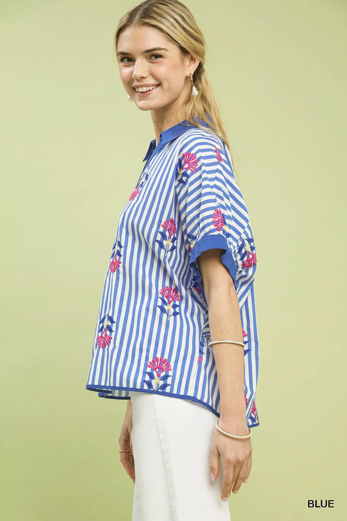 This stripe embroidered button-front boho top features a split V-neck with button detail, adding a touch of casual elegance. The vertical stripes with floral embroidery create a chic and bohemian vibe. Short dolman sleeves with cuffs offer a relaxed and comfortable fit. This oversized top is perfect for effortless and laid-back styling. While not lined, this top is ideal for layering and versatile for various occasions.