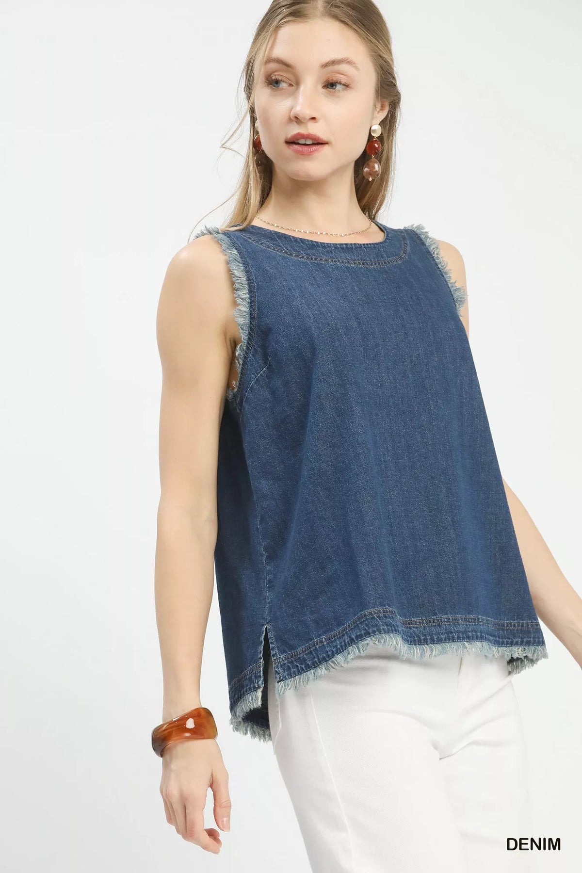 A denim sleeveless fringe hem top offers a stylish and edgy twist on a classic denim piece. The sleeveless design is perfect for warmer weather and adds a contemporary touch to the top. The fringe hem detail creates movement and a bohemian vibe, adding flair to the overall look. This top is versatile and can be paired with shorts, jeans, or skirts for a casual yet trendy outfit. Overall, a denim sleeveless fringe hem top is a chic and statement-making choice for a fashion-forward ensemble.