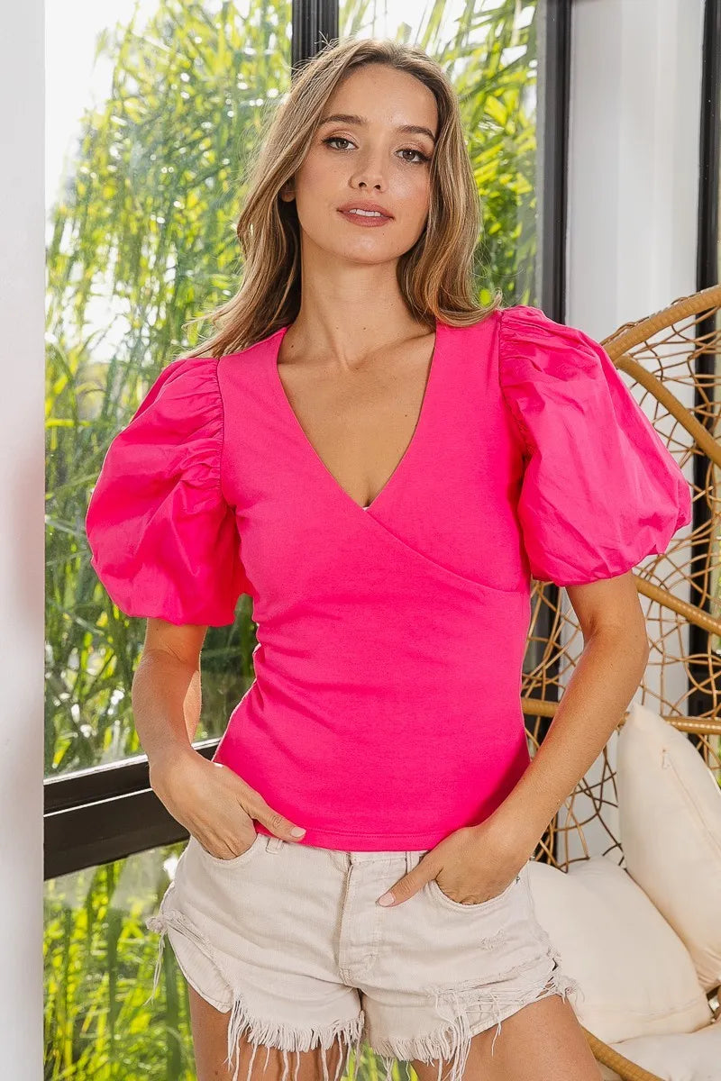 This rib knit top features a front wrap design with a flattering V-neckline and stylish puff sleeves. The ribbed texture adds a touch of texture and dimension to the top. Perfect for adding a trendy and feminine touch to your outfit, this top can be paired with high-waisted pants or skirts for a chic and fashionable look.